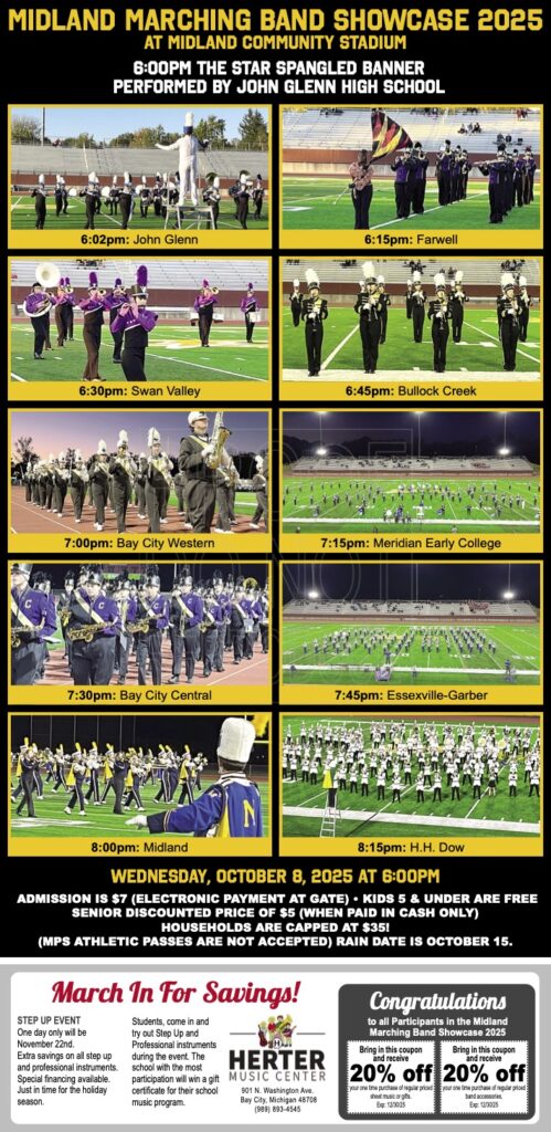 Band Showcase is just around the corner on October 8th at Midland Community Stadium. Tickets are available at the gate. Come early to get your seat! There will be a reserved handicapped accessible area near the fence around the track close to the school for wheel chairs and seating for those needing mobility accommodations at the bottom of the bleachers on either end of the stadium seating. Please come early if this is a need but limit access to only those with accommodations, not entire families. Thank you!